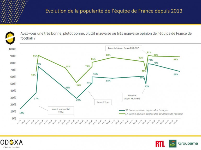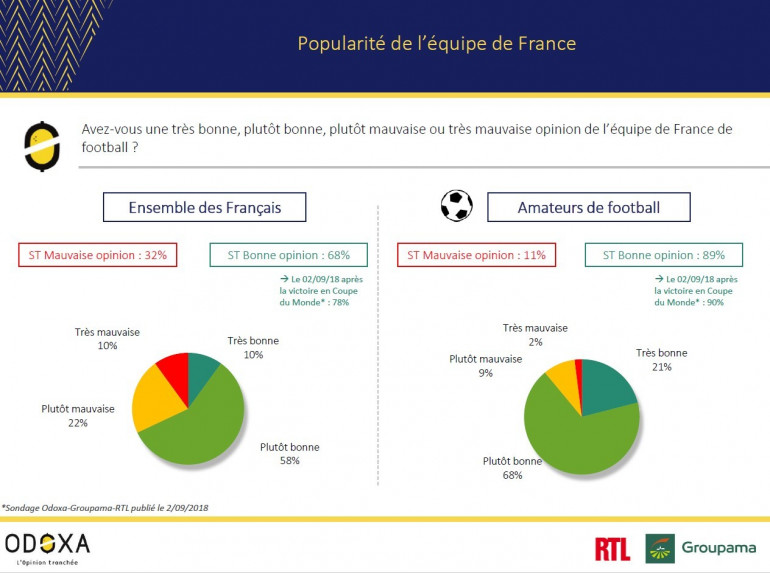 Les amateurs de ballon rond, eux, restent très attachés à ce groupe, malgré la défaite en Turquie en juin ou aux Pays-Bas durant l'automne dernier. Ils sont 89% à avoir une bonne opinion de la sélection bleu-blanc-rouge (21% très bonne, 68% plutôt bonne).