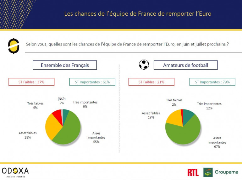 Pour le championnat d'Europe des nations 2020, les Français sont globalement confiants : 61% d’entre eux estiment que les chances de victoire finale des Bleus sont importantes. Mais lorsque l’on s’intéresse au détail des résultats, on note qu’ils ne sont que 6% à juger ces chances sont très importantes.
