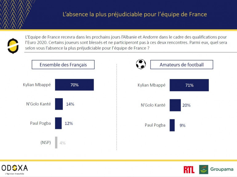 Dans l'immédiat, pour le match de qualification à l'Euro 2020 France-Albanie (samedi 7 septembre, 20h45) c'est Kylian Mbappé qui manquera le plus aux Champions du Monde, estiment les Français. Ces derniers sont optimistes pour l'an prochain : 61% jugent importantes les chances des Bleus de remporter le championnat d'Europe des nations en juin prochain.