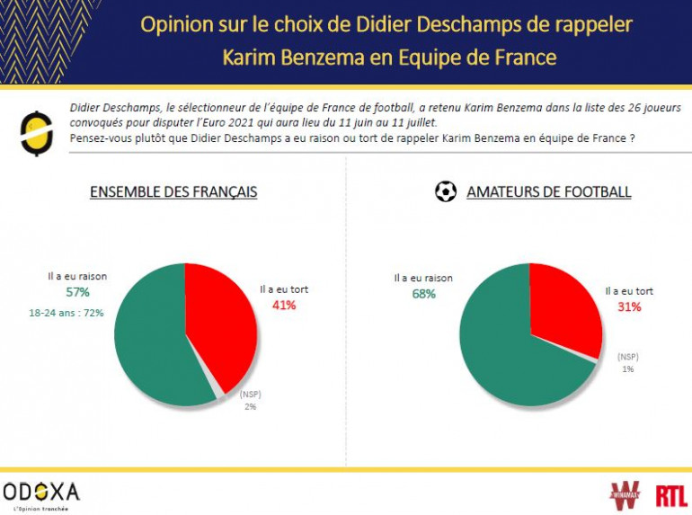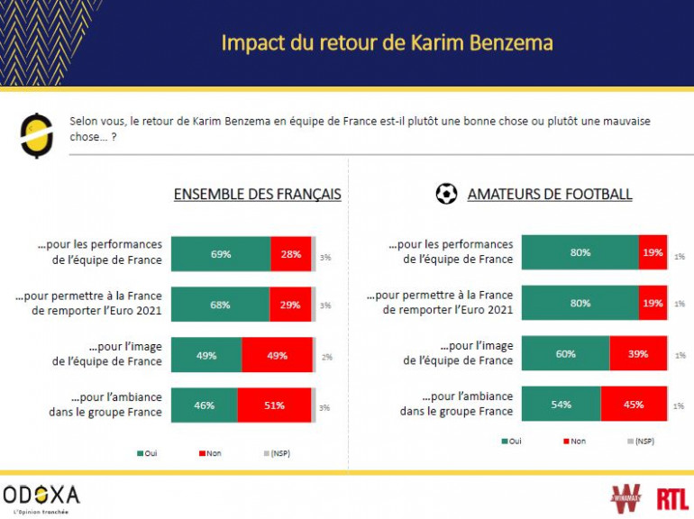 Le retour en équipe nationale d’un joueur qui compte 81 sélections et 27 buts et figure dans le top 5 des joueurs les plus titrés avec le Real Madrid est donc accueilli comme une bonne chose sur le plan sportif. De même, 68% des Français et 80% des amateurs de football jugent que ce retour est une bonne chose pour permettre à la France de remporter l’Euro 2021 et d’atteindre l’objectif d’un deuxième doublé Mondial-Euro après celui de 1998-2000.