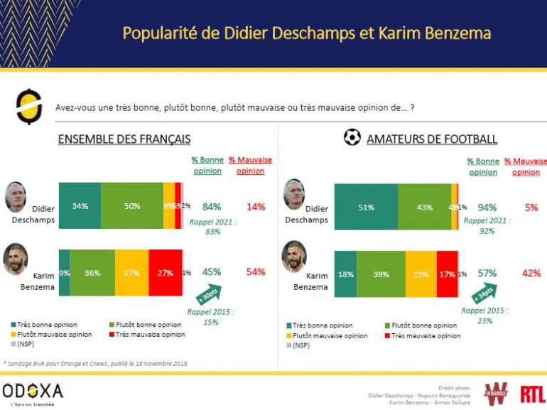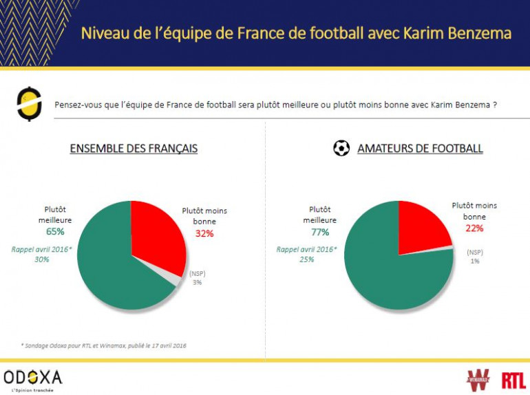 Avec l'ancien Lyonnais, dont la cote de popularité remonte en flèche, l'équipe de France sera "plutôt meilleure", pensent aussi 65% des sondés et 77% des amateurs de football. Pas sûr selon eux en revanche que la présence de "KB9" profite à l'image des champions du monde et à l'ambiance dans le groupe. Voici les principaux enseignements du dernier sondage réalisé par Odoxa pour RTL et Winamax.