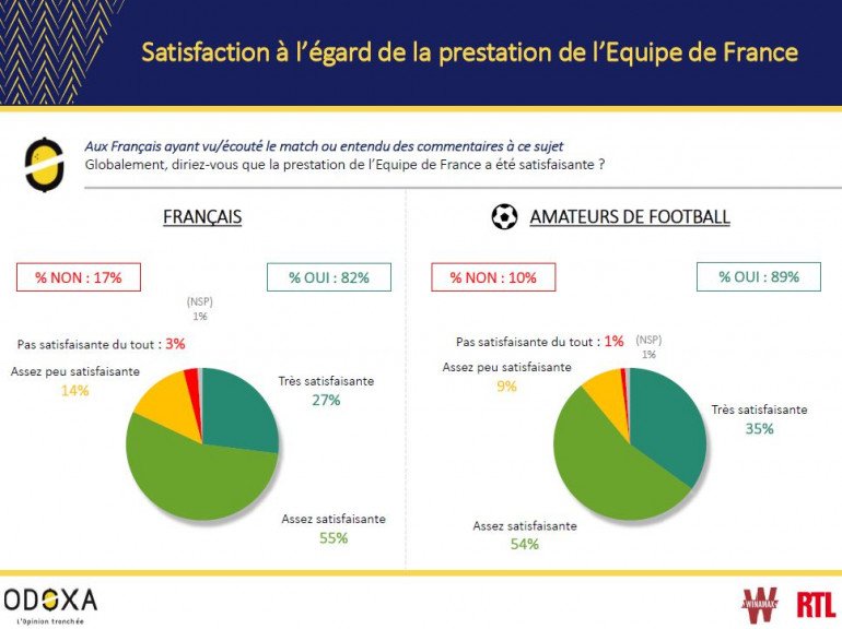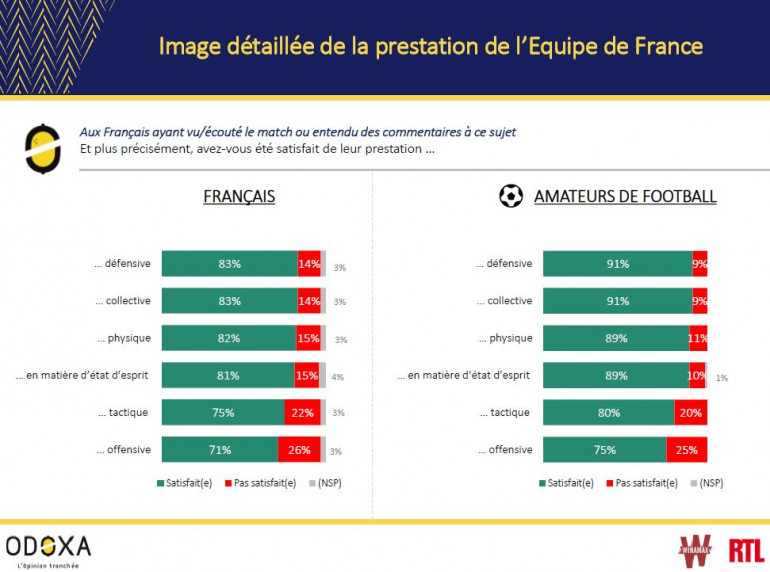 Ce chiffre monte même à 89% chez les amateurs de football. Notons tout de même que cet enthousiasme est relatif : 55% des Français jugent la prestation des Bleus assez satisfaisante (54% chez les passionnés) pour 27% l’ayant trouvé très satisfaisante (35% chez les passionnés).