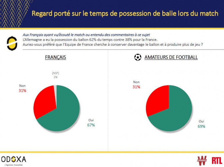 Les réserves, relatives, des Français sur la prestation offensive et tactique des coéquipiers de Kylian Mbappé s’expliquent par une certaine frustration. Les deux tiers des Français (67%) et des amateurs de football (69%) auraient en effet aimé voir un jeu davantage tourné vers la possession.