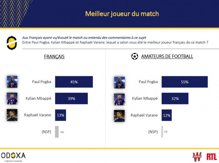 Paul Pogba a particulièrement impressionné les Français dans ce match. Présent offensivement, défensivement et techniquement, le milieu mancunien aura été au four et au moulin face aux Allemands. Il est selon eux l’homme du match (45%) et plus encore pour les amateurs de football (55%).