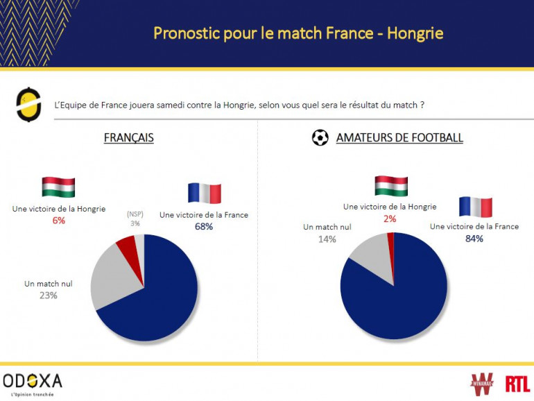 Les Français voient mal comment la prochaine rencontre des Bleus, ce samedi 19 juin à 15h, pourrait mal tourner. Les deux tiers d’entre eux et même 84% des amateurs de football pronostiquent une victoire face à la Hongrie. Ils ne sont que 6% et 2% à anticiper une