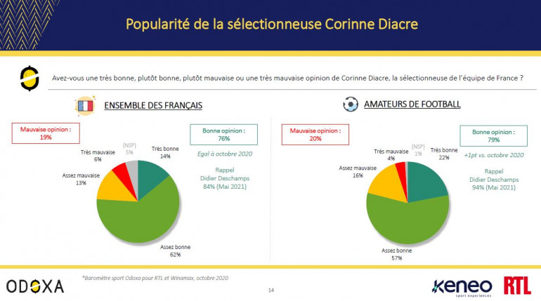 L‘équipe de France sera conduite à l‘Euro par une sélectionneuse qui dispose du soutien de la population et des spécialistes. 76% des Français et 79% des amateurs de football ont une bonne opinion de Corinne Diacre.