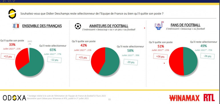 Du côté des fans de football, 51% d'entre eux souhaitent que Didier Deschamps quitte son poste de sélectionneur, en hausse de 26 points par rapport à juillet 2021. Concernant les joueurs, 74% des amateurs de football n’ont pas été satisfaits des performances de Kylian Mbappé, ce qui en fait le Bleu le plus décevant de l’Euro devant Marcus Thuram (62%). À l'inverse, 80% des amateurs de football sont satisfaits des performances de Mike Maignan, ainsi que de celles de N’Golo Kanté (79%) et de Theo Hernandez (71%).