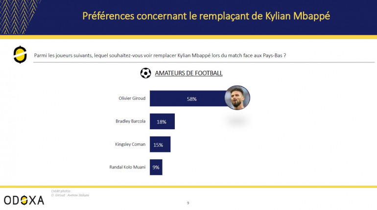 Si cela se confirme, les amateurs de football sont 58% à souhaiter voir Olivier Giroud retrouver une place dans le 11 de départ. Le meilleur buteur de l'histoire des Bleus (57 réalisations en 134 rencontres) devance de très loin Bradley Barcola (18%), Kingsley Coman (15%) et Randal Kolo Muani (9%).