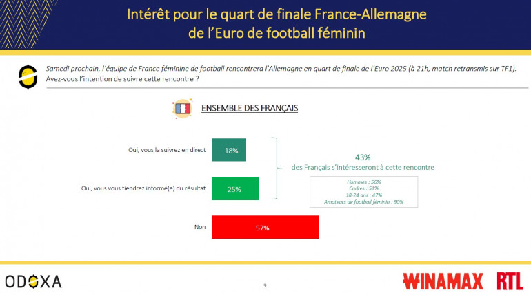 Voici les principaux enseignements du dernier sondage réalisé par Odoxa pour Winamax et RTL. L'enquête a été réalisée selon la méthode des quotas, sur internet, les mercredi 16 et jeudi 17 juillet 2025 auprès d'un échantillon de 1.005 personnes représentatives de la population française âgée de 18 ans et plus, dont 363 amateurs de foot féminin.