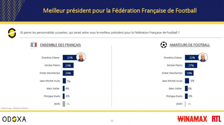 Celui qui ambitionne sans doute encore d'entraîner à court ou moyen terme, dans un club ou une sélection (pour la France il devra encore attendre puisque Didier Deschamps a été prolongé), arrive devant le duo Michel Platini-Didier Deschamps (24%). Jean-Michel Aulas est loin derrière (7%), de peu devant le président du club de Strasbourg Marc Keller et le président par intérim de la FFF Philippe Diallo (4%).