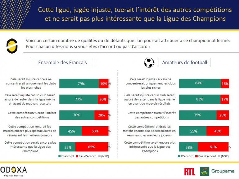 D’autant que les qualités que l’on pourrait voir dans une telle compétition ne sont pas attribuées à cette ligue. Pour 65% des Français et 61% des amateurs de football, elle ne serait pas plus intéressante que la Ligue des champions. Et même du point de vue du spectacle, l’opinion est réservée. 45% des Français et 55% des amateurs de foot estiment que les matchs seraient encore plus spectaculaires.