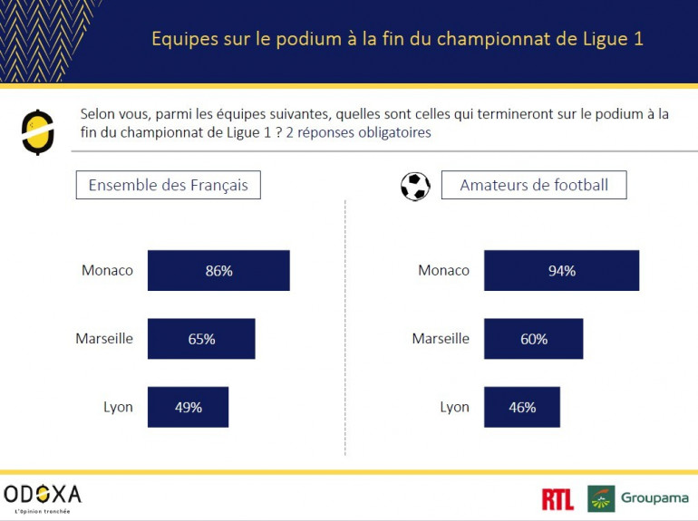En revanche, avec 7 longueurs sur Marseille (3e), le club de la Principauté est idéalement positionné pour terminer sur le podium. C'est aussi ce que pensent 86% des sondés. Marseille arrive en 2e position (65%) de ce questionnaire à trois avec Lyon (49%).