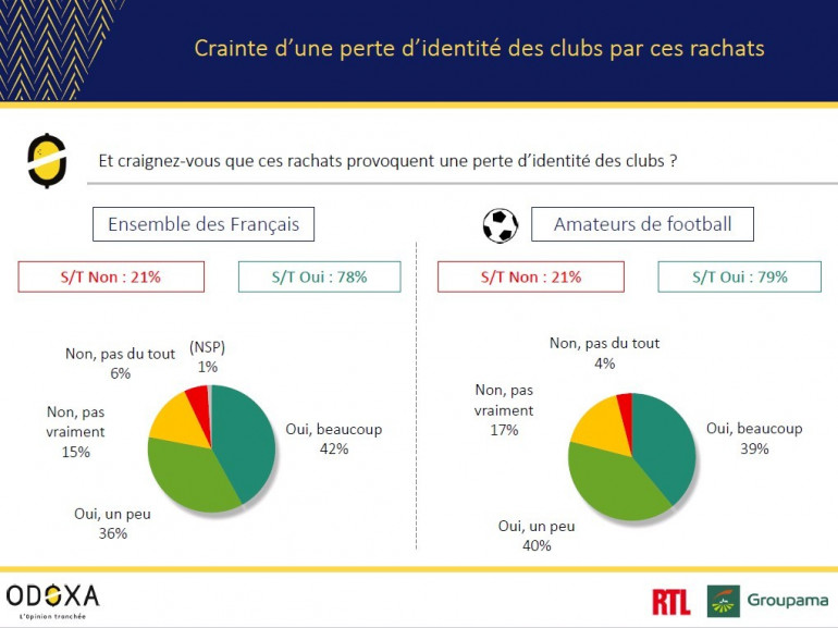 Ce que craignent à part quasiment égale (78 et 79%) les personnes interrogées, c'est la perte d'identité du club après un rachat. Aussi logique que paradoxal lorsque l'on souhaite voir ses couleurs briller toujours plus.