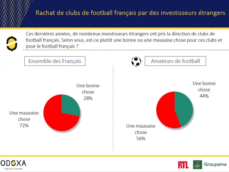 Pour près des trois quarts des sondés (72%), cette évolution est "une mauvaise chose". Les amateurs de ballon rond sont plus partagés, sûrement avec le sentiment que leur club sera plus compétitif, mais l'impression négative l'emporte aussi (56%).