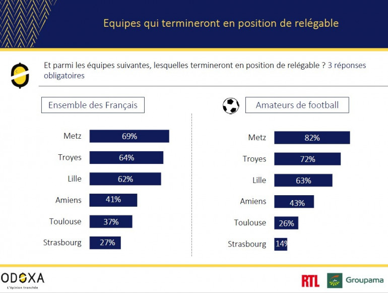 Les trois derniers avant la 30e journée de Ligue 1 le seront encore au soir de la 38e, mais pas dans le même ordre, ce qui a son importance. Les Françaises et les Français sondés placent Metz, actuelle lanterne rouge, en tête des équipes qui termineront en position de relégable (69%).