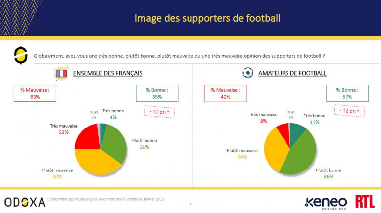 Seuls 35% des Français ont une bonne opinion des supporters de football, un résultat en baisse de 10 points en six mois. Les supporters sont perçus comme joyeux (68%), indispensables au spectacle (63%) et chaleureux (55%), mais les Français les qualifient aussi d’idiots (57%) voire les jugent dangereux (55%).