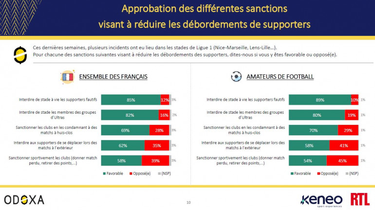 Les sanctions visant davantage les clubs sont aussi majoritairement approuvées mais avec un accueil plus réservé ; 69% des Français et 70% des amateurs de football sont favorables aux matchs à huis clos tandis que 58% et 54% approuvent les sanctions sportives.