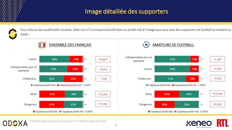 Dans le même temps, les Français associent davantage les qualificatifs négatifs aux supporters de football. 57% affirment ainsi que le terme "idiots" s’applique bien (+8 pts) à eux. Plus grave encore, 55% les qualifient de dangereux (+4 pts). Les amateurs de football sont plus positifs mais les récents épisodes ont eu des effets sur leur opinion des supporters. 55% les jugent idiots (+12 pts) et 45% estiment qu’ils sont dangereux (+3 pts).
