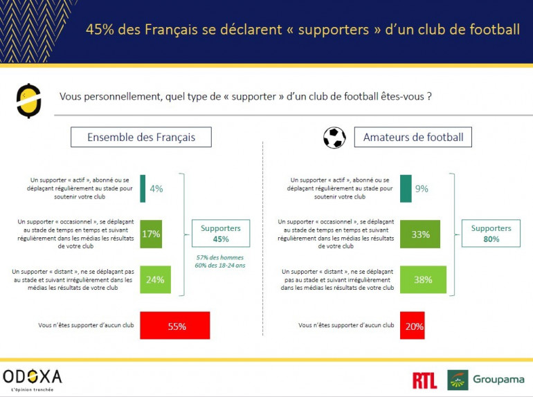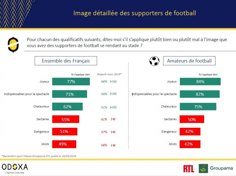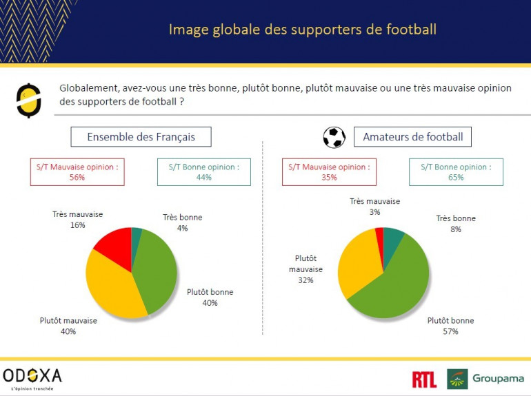 45% des Français et des Françaises supportent un club (dont 21% qui vont au stade parfois ou souvent). L'image des supporters reste globalement négative mais les qualificatifs qui leur sont associés sont largement plus positifs que négatifs. La haine exprimée par certains d'entre eux reste marginale.