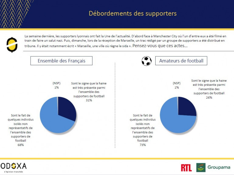 Invités à se prononcer sur ces actes, les Français estiment à 68% qu’ils sont le fait de quelques individus isolés non représentatifs de l’ensemble des supporters de football. 31% estiment au contraire qu’ils sont le signe que la haine est très présente chez l’ensemble des supporters. En mars derniers, 52% d’entre eux estimaient que la violence était généralisée parmi les supporters de football.