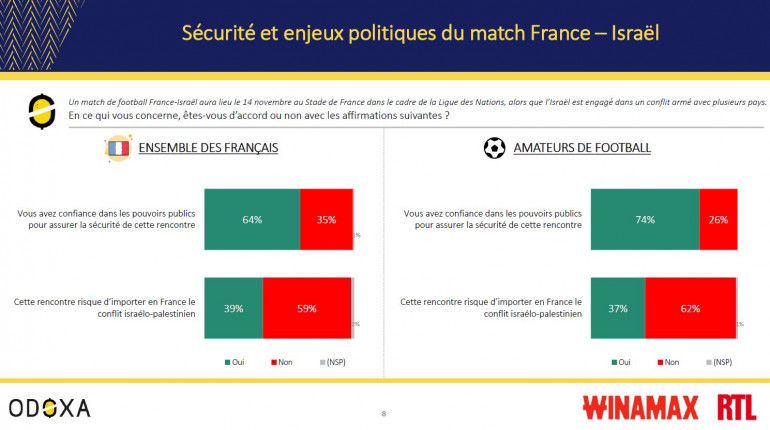 Sereins sur l’issue sportive de la rencontre - 59% pronostiquent une victoire de la France, 34% un match nul et uniquement 4% une victoire d’Israël -, les Français le sont aussi sur l’organisation de cette rencontre à haut risque, jeudi 14 novembre (20h45) au Stade de France dans le cadre de la Ligue des Nations : 59% ne craignent pas que ce match "importe en France le conflit israélo-palestinien", 64% ont confiance dans les pouvoirs publics pour assurer la sécurité du match et 74% pensent qu’il ne doit pas se dérouler à huis-clos mais avec du public (quitte à avoir une jauge réduite).