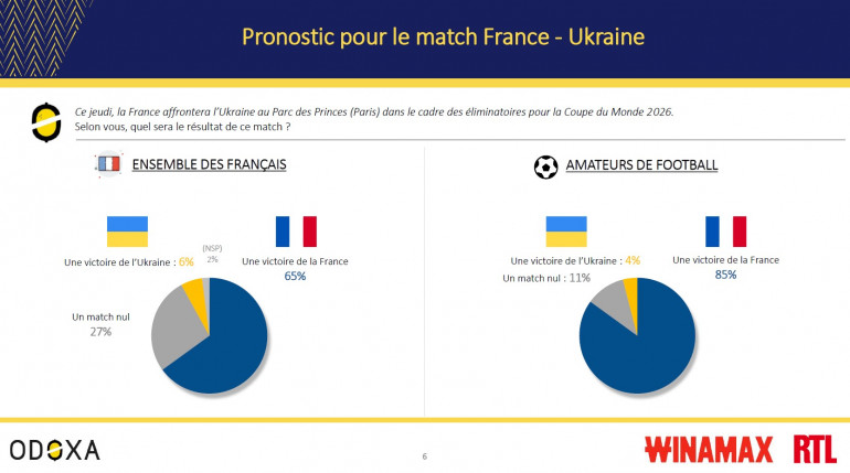 Chez les amateurs de foot, le pourcentage de victoire de l'équipe de France monte à 85%, quand celui de l'Ukraine baisse encore à 4%. En conséquence, 77% du grand public pense que Kylian Mbappé et ses partenaires se qualifieront pour la prochaine Coupe du monde aux États-Unis, au Canada et au Mexique (44% probablement, 33% certainement).