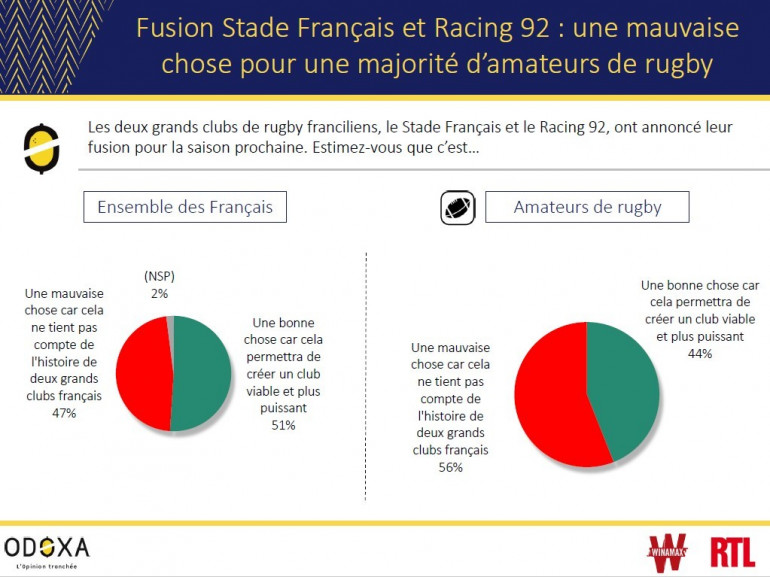 Comment les Français et plus particulièrement ceux qui s’intéressent au rugby perçoivent-ils la fusion des deux clubs ? Les premiers sont partagés : 51% des Français y voient une bonne chose car cela permettra de créer un club viable et plus puissant quand 47% d’entre eux y voient plutôt une mauvaise chose car cela ne tient pas compte de l’histoire de deux grands clubs français.