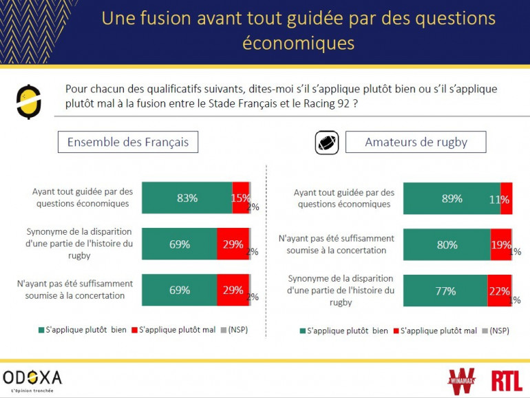 1. Pour 56% des amateurs de rugby, la fusion est une mauvaise chose. 2. Pour une très large partie des Français et des Françaises interrogés, ce rapprochement est avant tout guidée par des questions économiques (83%), synonyme de la disparition d’une partie d’histoire (69%) et n’a pas été suffisamment soumise à la concertation (69%). 3. La réussite sportive n’est pas évidente.