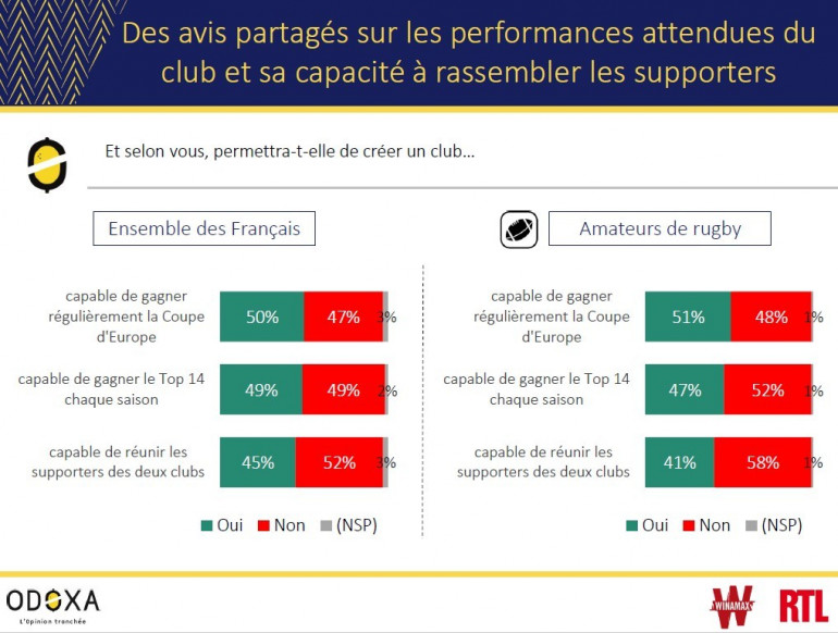 50% des Français et 51% des amateurs affirment que le club issu de la fusion sera capable de gagner régulièrement la Coupe d’Europe. Même constat sur le plan national : 49% des Français et 47% des amateurs de rugby estiment que le club sera capable de gagner le Top 14 chaque saison.