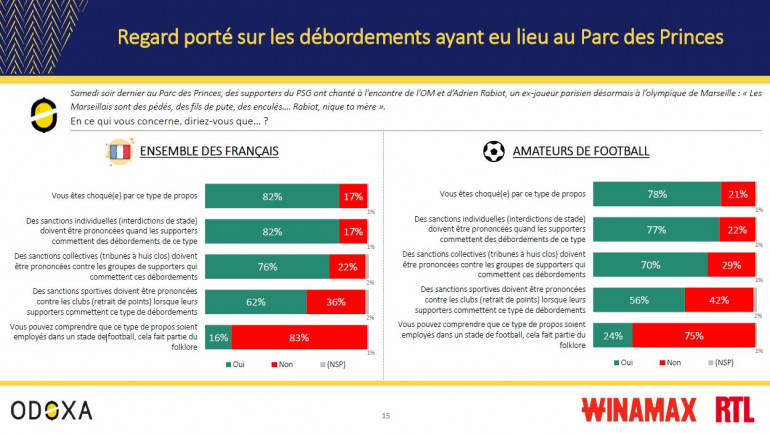82% des Français interrogés se disent "choqués par ce type de propos" et attendent "des sanctions individuelles comme des interdictions de stade pour les supporters responsables. 76% sont favorables à des "sanctions collectives (tribunes à huis clos) contre les groupes de supporters qui commettent ces débordements". 62% espèrent même voir les clubs sanctionnés. Seuls 16% des Français sondés disent "comprendre ces propos" et les associent à une forme de "folklore" du football.
