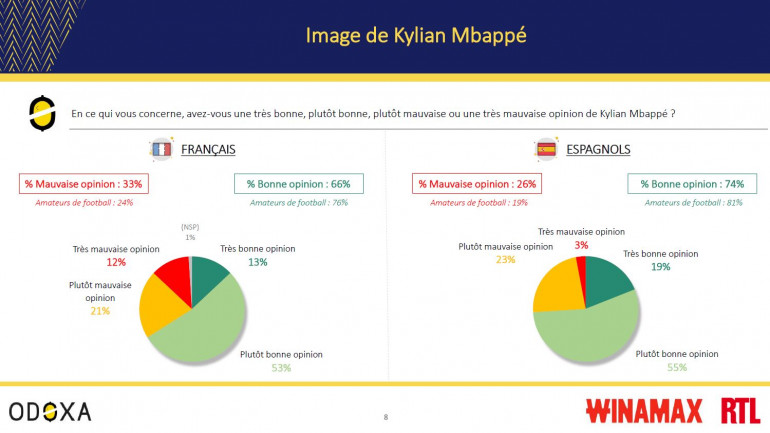 Une fois n'est pas coutume, le dernier sondage Odoxa a été réalisé en France mais aussi en Espagne. Il porte sur Kylian Mbappé, avec le principal constat l'attaquant de l'équipe de France et du PSG est plus populaire côté espagnol (74% de bonnes opinions) que côté français (66%).