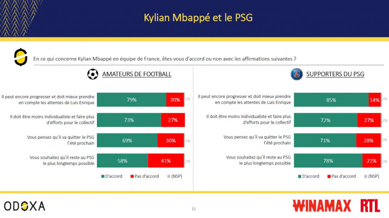 Cependant, son image s’est dégradée depuis 2019 : il est jugé moins sympathique (67%, -13 points) et moins humble (47%, -19 pts) par les Français. Pour les amateurs de football, il doit être moins individualiste (73%) et peut encore progresser en prenant en compte les attentes de son entraîneur en club Luis Enrique (79%), chiffre qui grimpe à 85% pour les supporters du PSG.