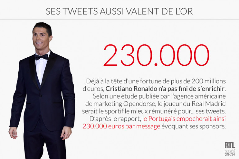 Suivi par quelque 38 millions de personnes sur Twitter et plus de 106 millions sur Facebook, un record, le joueur du Real Madrid est régulièrement sollicité par ses sponsors pour poster des messages publicitaires. Des demandes qu'il sait parfaitement comment monnayer. Ainsi, selon une étude publiée par l'agence américaine de marketing Opendorse, "CR7" recevrait 230.000 euros par tweet promotionnel partagé sur son compte, pour sa dernière paire de chaussure ou un produit cosmétique, par exemple.