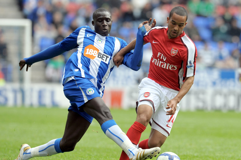 Steve Gohouri (à gauche) au duel avec Wigan contre Théo Walcott (Arsenal) le 18 avril 2010