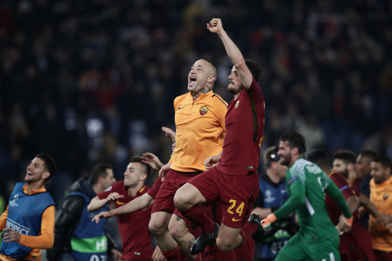 Les joueurs de l'AS Rome célèbrent leur victoire en quart de finale de Ligue des champions face au Barca, le 10 avril 2018
