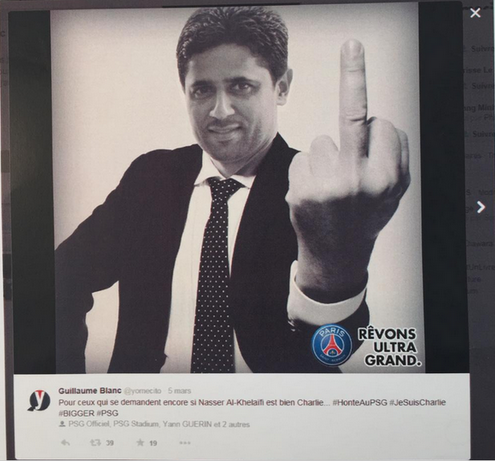 Guillaume Blanc, qui a assisté à la scène, s'indigne alors sur Twitter. Dans un tweet publié le 5 mars, avec son compte @Yomecito qui dispose de plus de 41.000 abonnés, il écrit donc : “Pour ceux qui se demandent encore si Nasser Al-Khelaïfi est bien Charlie”, en référence au fameux slogan "Je suis Charlie" des attentats de Paris de janvier dernier. Le message est accompagné d'une photo détournée du président qatari du PSG faisant un doigt d’honneur. Un montage directement inspiré de la campagne de Reporters sans frontières datant de 2013 montrant des leaders internationaux, tels que Bachar Al-Assad, Mahmoud Ahmadinejad ou encore Vladimir Poutine, affublés d’un faux doigt ou bras d’honneur.