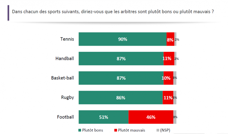 Car cette proportion n'est pas la même selon les sports. Ainsi, les hommes au sifflet sont souvent jugés compétents au basket-ball (87%), handball (87%) et rugby (86%). S'il y a un sport dans lequel les arbitres sont loin de faire l'unanimité, c'est bien le football : seulement 51% des Français les trouvent bons.