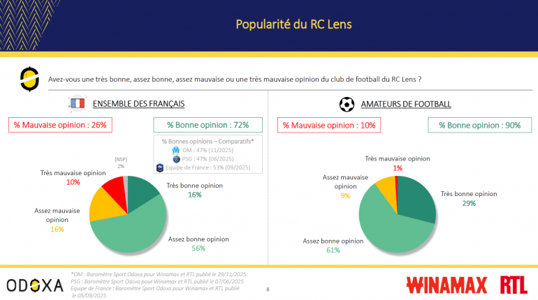 Au-delà des excellents résultats du RC Lens, si les Français croient en cette belle histoire, c'est aussi parce qu'ils apprécient ce club. En effet, pas moins de 72% de nos concitoyens ont une bonne opinion de l'équipe artésienne. La côte de popularité des Lensois est nettement supérieure à celle de ses deux dauphins en Ligue 1. Au lendemain, de sa victoire en finale de Ligue des Champions, le PSG ne faisait pas l'unanimité. Seulement 47% des personnes interrogées déclaraient en avoir une bonne opinion. En novembre dernier, les Phocéens étaient plébiscités à un niveau équivalent (47%).