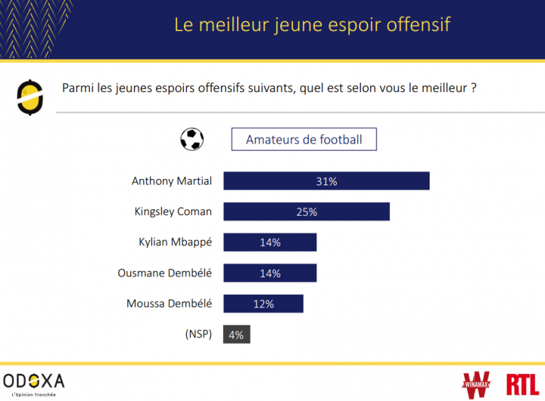 Enfin le sondage Odoxa pour RTL et Winamax s'est intéressé aux jeunes espoirs offensif français. Parmi Anthony Martial, Kingsley Coman, Kylian Mbappé, Ousmane Dembélé et Moussa Dembélé, qui est le meilleur ? C'est la question simple posée aux amateurs de football uniquement. Une demande qui ne concerne pas le 8e de finale de "Champions" mais on y retrouve plusieurs joueurs ou anciens joueurs de Ligue 1.