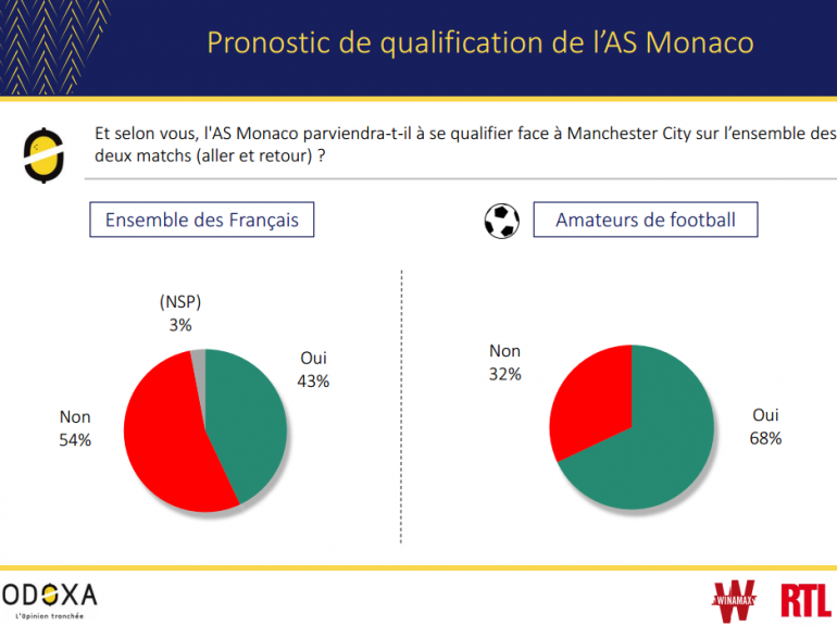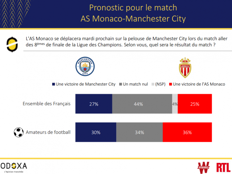 La seconde confrontation entre City et l'ASM sera joué le mercredi 15 mars à 20h45 au stade Louis-II et cet avantage devrait donc être payant. Les Français dans leur ensemble sont moins optimistes pour Monaco. Ils sont minoritaires à miser sur leur qualification et sont 54% à penser que le deuxième de Premier League passera au tour suivant.