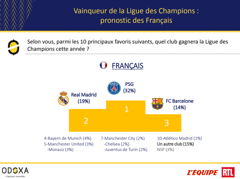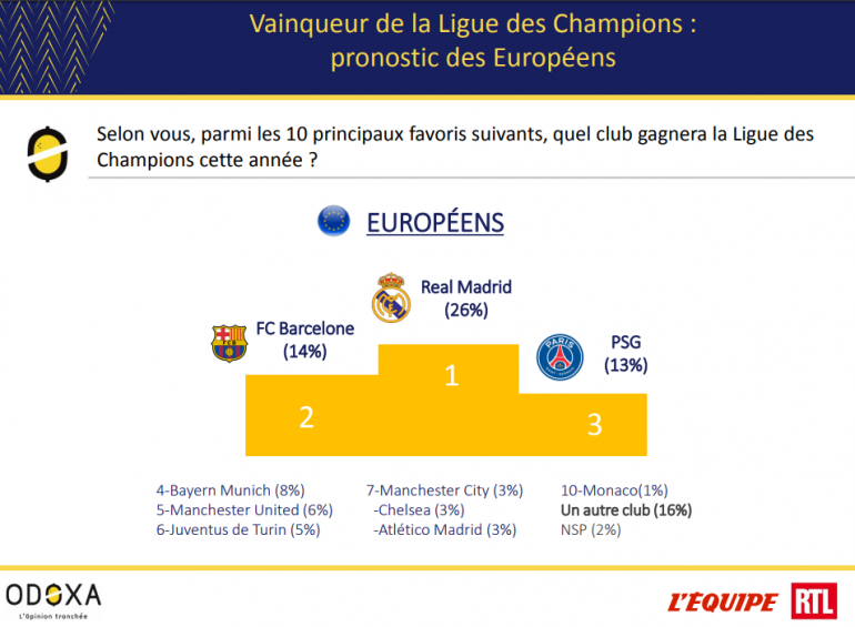 À l'échelle européenne, le sondage Odoxa pour RTL et L'Équipe donne cependant toujours un avantage au Real Madrid, double tenant du titre. Plus d'un Européen sur quatre (26%), voit les joueurs de Zinedine Zidane s'imposer. 14% d'entre eux estiment que le Barça a le plus de chances de triompher, contre 13% pour le PSG. Les Parisiens devancent des géants du football européen comme le Bayern Munich (8%), Manchester United (6%) et Manchester City (3%), pourtant impressionnant depuis le début de la saison.