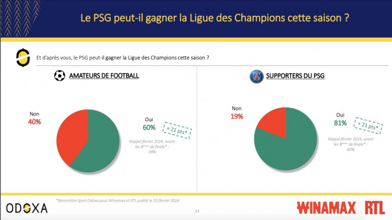 En France, nombreux sont ceux à voir le club de la capitale aller au bout. Selon le baromètre Odoxa pour Winamax et RTL, six amateurs de football sur dix pensent que le Paris Saint-Germain peut gagner la Ligue des Champions cette saison. Et ce, malgré la présence du Real Madrid et du Bayern Munich, deux mastodontes du football européen, dans l'autre demi-finale. Du côté des supporters parisiens, 84% d'entre eux se voient déjà en finale et 81% estiment que leur club peut la gagner.