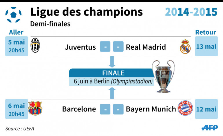L'affiche entre le FC Barcelone et le Bayern Munich sera un remake de la demi-finale de la saison 2012-2013. Vainqueurs 4-0 en Allemagne, les joueurs de Jupp Heynckes avaient fait vivre une deuxième humiliation au retour en Espagne à ceux du regretté Tito Vilanova : 0-3 au Camp Nou. Le Bayern avait ensuite gagné une finale 100% allemande ensuite face au Borussia Dortmund 2-1.