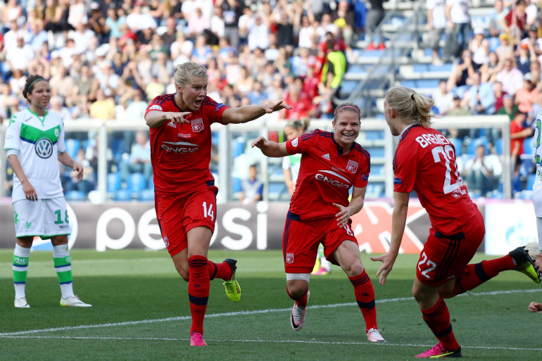 L'attaquante lyonnaise Ada Hegerberg célébrant son but en finale de la Ligue des champions féminine, lors de Wolfsburg-OL le 26 mai 2016