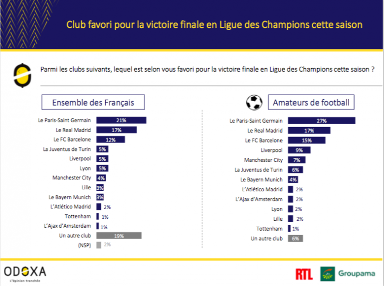 Les Parisiens sont les grands favoris de la compétition pour 21% des Français. Ils devancent ainsi le Real de Madrid (17%) et le FC Barcelone (12%).