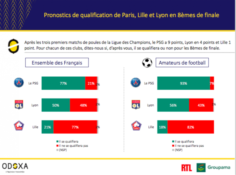 Trois clubs français sont présents en Ligue des champions cette année, le Paris Sain-Germain, l'Olympique Lyonnais et le Lille Olympic Sporting Club. 77% des Français croient en les chances du PSG et un sur deux en celles de l'OL pour se qualifier en huitièmes de finale. En revanche, ils considèrent que le Losc ne passera pas l'étape (77%).