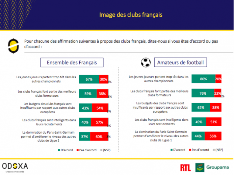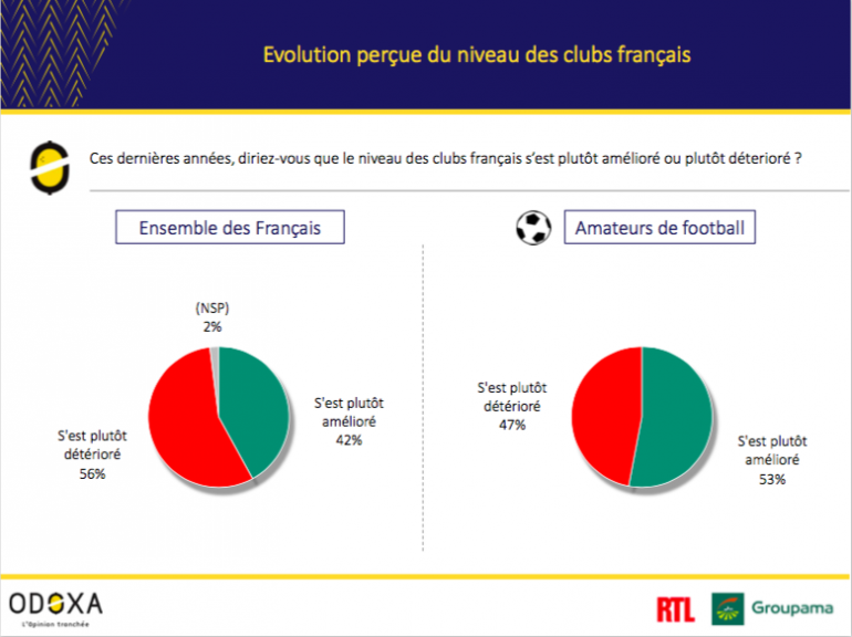 D'après le baromètre, le Paris Saint-Germain n'est pas représentatif des autres clubs français. En effet, sur l'ensemble des Français, 56% pensent que le niveau des clubs hexagonaux s'est détérioré ces dernières années. À l'inverse, les amateurs de football estiment à 53% qu’il s’est plutôt amélioré.