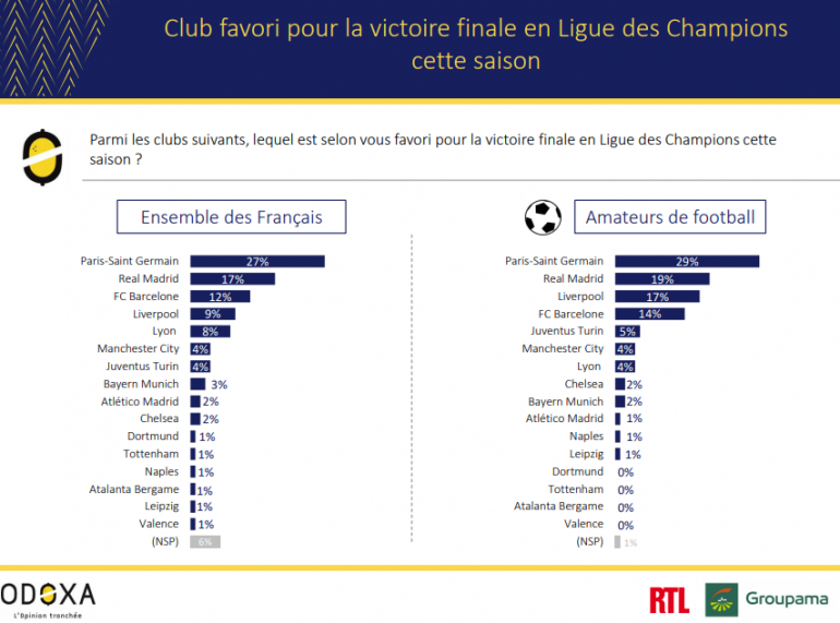 Français. Pour 27% des Français et 29% des amateurs de football, le PSG est le favoris de cette édition, devant le Real Madrid (17% et 19%), le Barça (12% et 14%) et le tenant du titre Liverpool (9% et