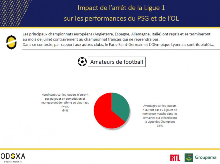 Invités à se prononcer, les amateurs de football jugent majoritairement que l’arrêt de la Ligue 1 constitue un handicap (64%) plutôt qu’un avantage (36%) pour le PSG et l’OL par rapport à leurs adversaires.
