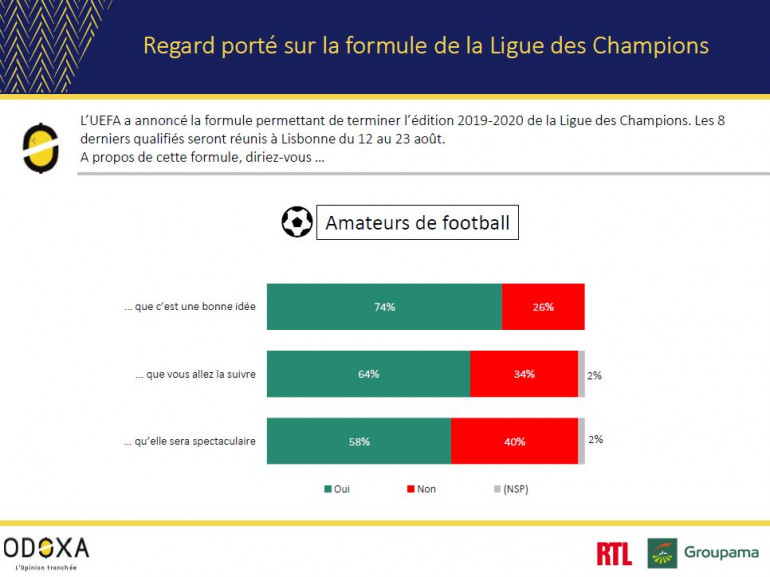 Le format séduit particulièrement les amateurs de football. 74% de ces derniers affirment en effet que c’est une bonne idée. Et pour 58% d’entre eux, cette formule sera spectaculaire même si les stades seront probablement vides. Surtout, cette phase finale organisée en plein milieu des vacances promet d’être particulièrement suivi. 64% des amateurs de football nous indiquent en effet cette intention.